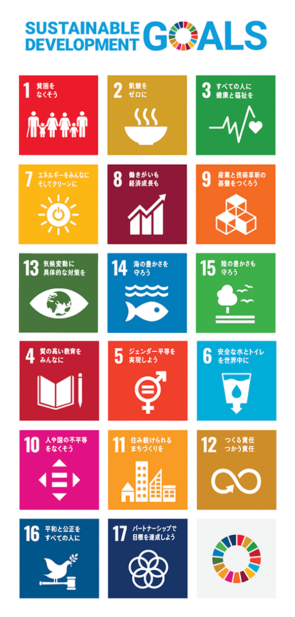 2015年9月「国連持続可能な開発サミット」にて採択された「持続可能な開発のための2030アジェンダに記載されている2016年から2030年までの国際目標です。貧困に終止符を打ち、地球を保護し、全ての人が平和と豊かさを享受できるようにすることを目指し、