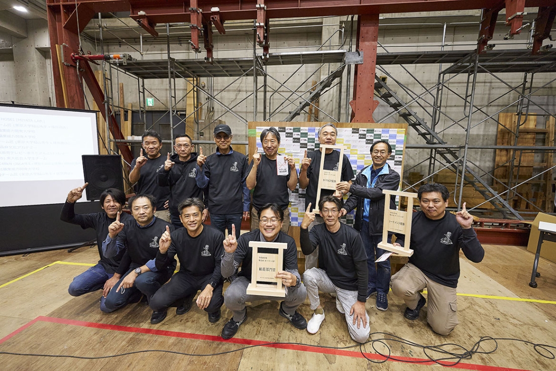 AQ Groupは、稲山正弘教授(東京大学)・篠原商店とのプロチーム「AQチーム匠」としてエントリー。学生や他企業と競い合いながら20年以上スポンサードとしても参加しています。今年は2年前に滋賀職業能力開発短期大学校に敗北した耐力壁「ヴィーナスの誕生」を改良進化させた「ヴィーナスの逆襲」で参戦。ラーメン柱と6本の横貫材で構成され、ラーメン柱と貫の接合部のめり込みにより、高耐力と高靭性を兼ね備えた耐力壁です。1回戦(VS 東京大学木質材料学研究室)、2回戦(VS(仮称)東大社会人学生チーム)、決勝戦(VS TEAM HOSEI)の激戦を勝ち抜き、トーナメント優勝・総合優勝のW優勝を達成しました。また、26年続く大会史上最高の最大耐力“71.2KN”を達成し大会新記録を更新し、耐震部門賞を受賞しました。