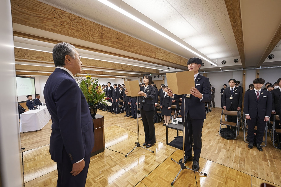 新入社員の未来が希望溢れるものとなるよう想いを込め、新社屋で入社式を開催。「新入社員」と「新社屋完成」で共通する「新たな始まり」を連想させる「新たな出発と未来への挑戦」をテーマとしました。