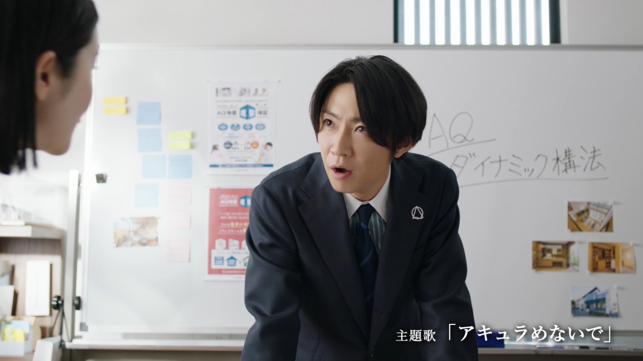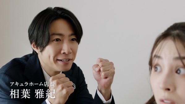 相葉さん「アキュラホームのCMに出演します、店長の相葉雅紀です。今回はアキュラホームで作れる広々とした空間を伝えられるよう、久しぶりの壁ドンも披露させていただきました。ぜひご覧いただけたら嬉しいなと思います!皆さんも理想の家をあきらめないで!」