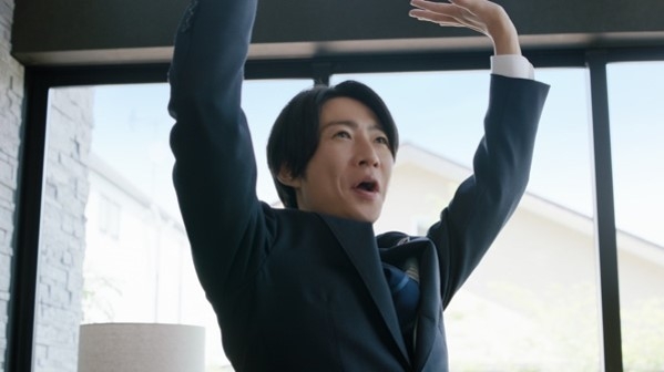 場面は一転、お店に戻った相葉店長は、真剣な眼差しで「壁も柱もない家をつくるぞ!」と宣言し、いきなり壁にドンっと手をつく。どきっとした後輩ですが、この相葉店長の行動は不要な仕切り壁を取り除いて、部屋を広く使う、というアイデアだったのです。「壁はなくせるのさ」というセリフとともに、相葉店長は全身を使って次々と不要な壁や柱を消し、さらには天井までも押し上げ、無駄のない構造で圧倒的な広さのリビングを実現。