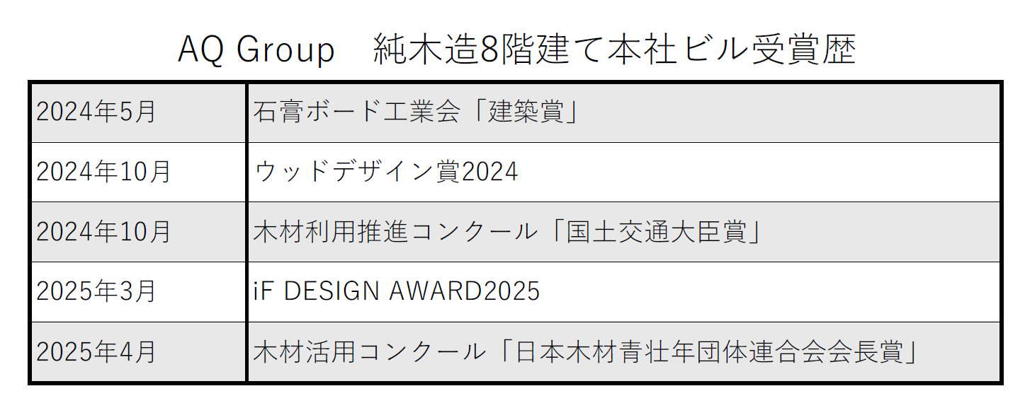 年間2,000棟規模の木造戸建て住宅を提供しているAQ Groupは、2024年3月に純木造8階建て本社ビルを竣工。日本伝統の木造軸組工法をベースとしつつ、業界でも類を見ない高倍率耐力壁の開発・活用や、一般流通材の組み合わせなどによって誕生した当ビルは、世界三大デザイン賞に数えられる「iF DESIGN AWARD2025」をはじめ、多数の表彰をいただいております。このほど当ビルが受賞したのは、日本木材青壮年団体連合会が主催する「木材活用コンクール」。「木材活用コンクール」は木材の新たな利用と普及の可能性を模索し、木材業界の活性化に寄与することを目的として1997年に創設されたもの。弊社としては2017年に開催された第21回木材活用コンクールにおいて、つくば支店(現・AQ Group北関東支社茨城支店)が「(公財)日本住宅・木材技術センター理事長賞」を受賞しており、今回で2回目の受賞となります。