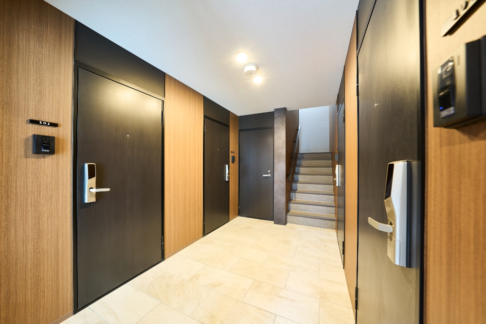 また、都心部の狭小間口を考えた設計であることも大きな特長。限られたスペースでも共用部(通路・階段)を建物中央に配し、すべての住戸を2面採光・通風の角部屋としました。このような合理的かつ柔軟性のあるプランニングは、加工がしやすい木造マンションならではの設計思想。さらに、木造でできた空間は消臭、除菌、抗菌、抗酸化、ストレスホルモンの抑制といった「フィトンチッド効果」も期待できます。入居者には「都市部でありなが森の中にいるような空間で過ごす」という価値観が提供できる賃貸住宅となっています。
