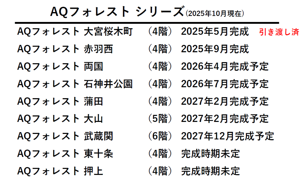 AQ Groupが手掛ける純木造賃貸マンション「AQフォレストシリーズ」は、2025年5月に第1弾となる「AQフォレスト大宮桜木町」がリリースされました。話題性から早期に注目していた投資家が6月に買い付けを取得。また、「鉄筋コンクリート造などのマンションと比べて性能は同等以上でありながら、木造ならではの住み心地の良さを兼ね備えている」、「地球環境にも貢献でき、あらゆるステークホルダーのニーズを満たしている」と、経済アナリストや建築有識者、不動産事業関係者、金融機関などから高いも評価を得ました。完成イベントや有名テレビ番組露出などを経て、入居募集を開始。賃貸集合住宅業界では厳しいとされている夏の時期であるにもかかわらず早期満室となり、物件購入者へ引き渡しが完了しています。現代にマッチした賃貸住宅として、大きなインパクトを与えました。