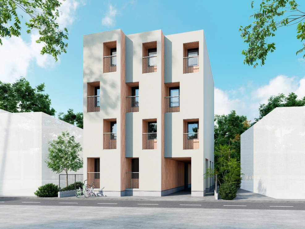 建築地:東京都板橋区大山西町40番、12、15、20、23、24、25、26/敷地面積:159.11㎡/建築面積:121.88㎡/延床面積:608.46㎡/工法:純木造軸組工法/階数:5階/用途:共同住宅