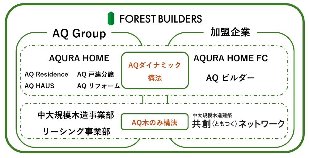 弊社は2024年に、日本最大級の木造建築集団を目指す「フォレストビルダーズ」を結成しました。「フォレストビルダーズ」には、弊社オリジナル技術「AQダイナミック構法」で戸建て住宅を建築する外部組織「アキュラホームFC」とボランタリーチェーンの「AQビルダー」があります。一方、「AQ木のみ構法」で中大規模木造建築を担う外部組織が、池田建設も所属する「ともつくネット」です。ともつくネットでは加盟企業に対し、「AQ木のみ構法」を軸とした“技術”、加盟企業同士が高め合う“場”、技術だけでなく経営を学ぶ“機会”の3つの価値を提供。技術研修、補助金申請のサポートなども含め、実務面から経営支援まで幅広くバックアップを実施することで、加盟企業が安心して中大規模木造建築を手掛けられる環境を整えています。