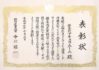 住宅建設コストを従来の約2分の1にまで削減する提案で、高い技術力やノウハウが認められ、建設大臣より表彰されました。