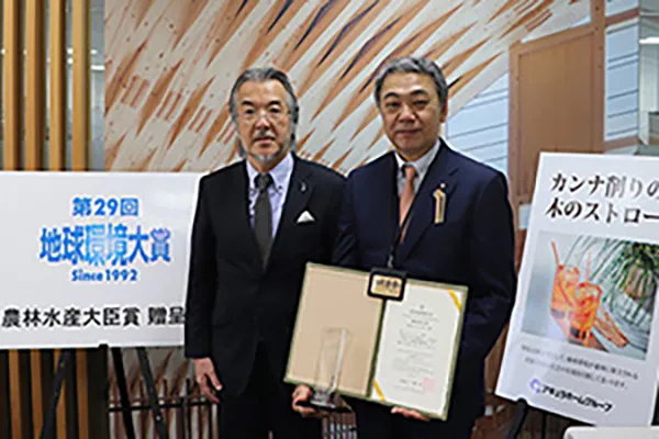 地球環境大賞は、フジサンケイグループが主催する2大大賞(世界文化大賞、地球環境大賞)の1つです。地球環境問題に取り組む企業として、間伐材などを活用した「木のストロー」の普及活動が評価されました。今回の受賞で、3度目の大臣賞受賞となりました。