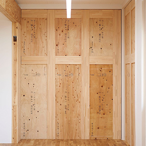 - 両面に24mm厚の国産針葉樹合板を張った、壁倍率約40倍相当の合板耐力壁です。